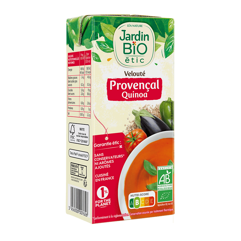 Jardin BiO étic brings you a soup made with sun-drenched tomatoes, blended with fresh basil and quinoa for a delightful organic starter or main dish. Made with carefully selected delicious organic ingredients, this tasty vegetable soup is cooked near Arras, north France.
